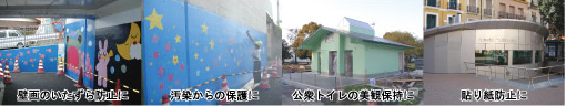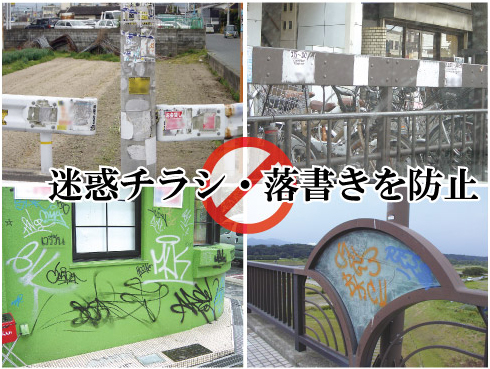 | プライムセラNo.300 (薄膜型) プライムセラNo.310 (厚膜型) | 特殊防汚 セラミック塗料 (2コート仕様、 プライマー要) | SiO2 | ・常温硬化 ・鉛筆硬度 (3~4H) ・不燃性 | ・落書き ・貼り紙防止対策 ・景観施設 ・建築、建造物 ・道路施設 ・機器の防汚、防錆等 |